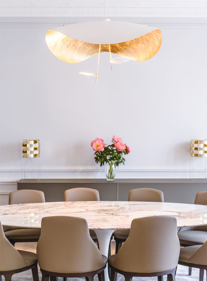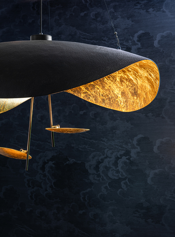 Lederam rappresenta il rigore del gesto fatto per tracciare una linea: i piccoli dischi dal colore caldo e morbido racchiudono un modulo LED dalla forma piattissima che permette di pensare in maniera leggera e di creare quindi lampade sottili dalle forme sospese con le linee curve e sinuose.