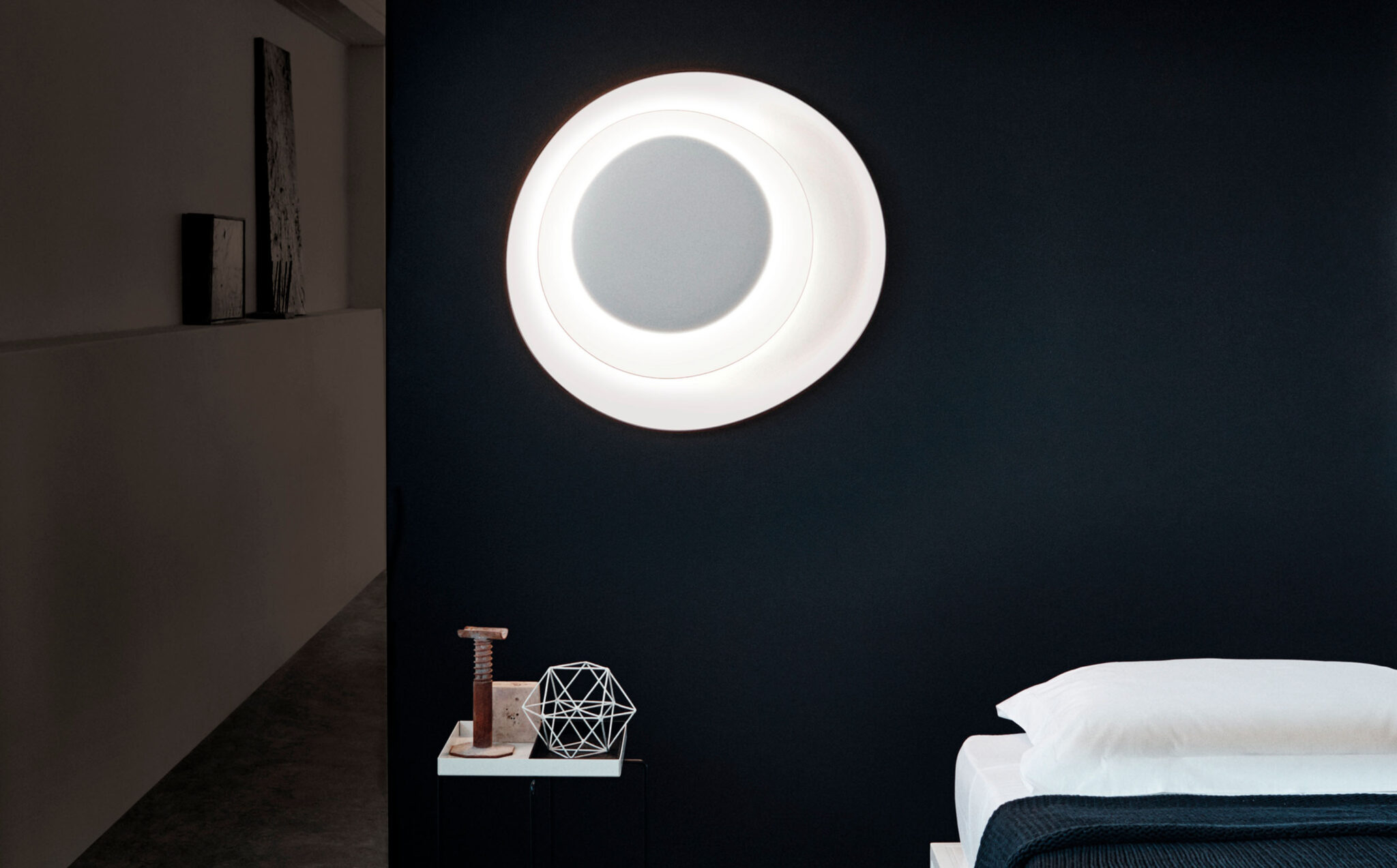 Asimmetrica composizione di forme, Bahia è una lampada da soffitto e parete di grandi dimensioni che decora e illumina con la sua scenografica essenzialità e il suo magico gioco di ombre e bagliori.
