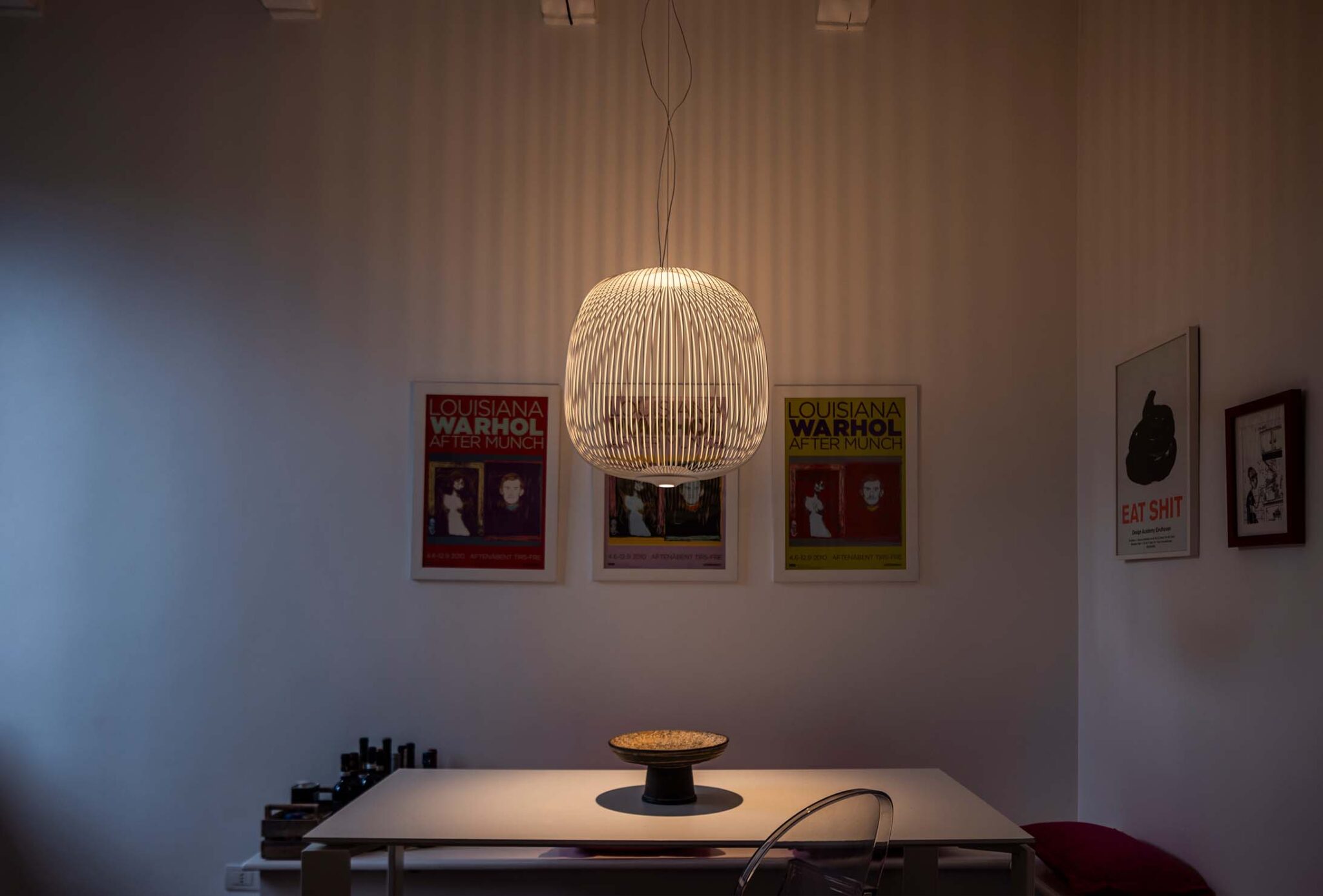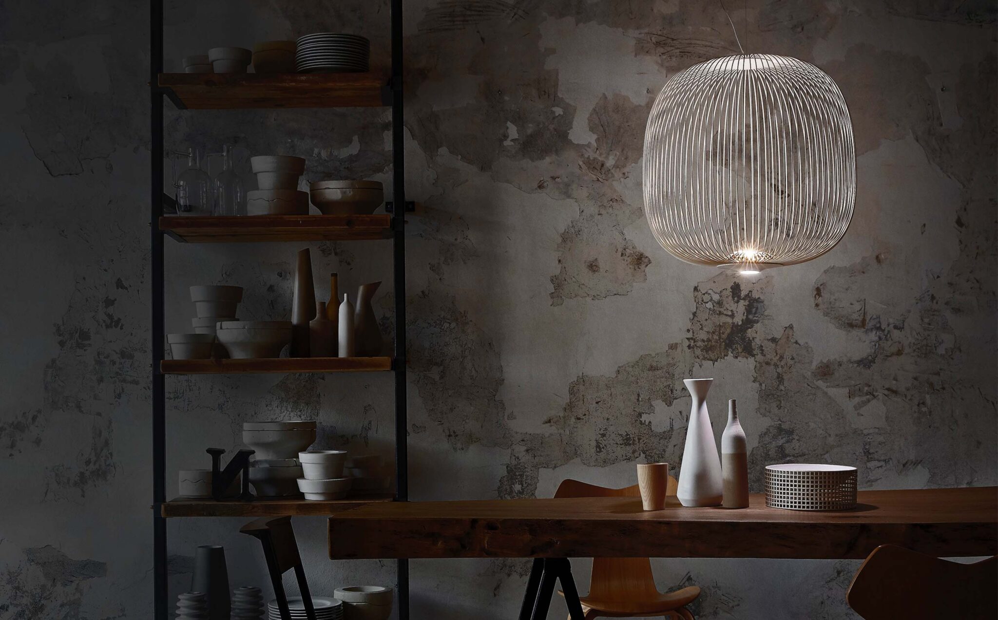 Spokes esprime una sensazione di leggerezza e movimento. Come attraverso un magico e geometrico reticolo, la luce filtra dall’interno, proiettando un caleidoscopio di vuoti e di pieni. La forma della lampada a sospensione Spokes 2 ricorda una lanterna o una voliera.
