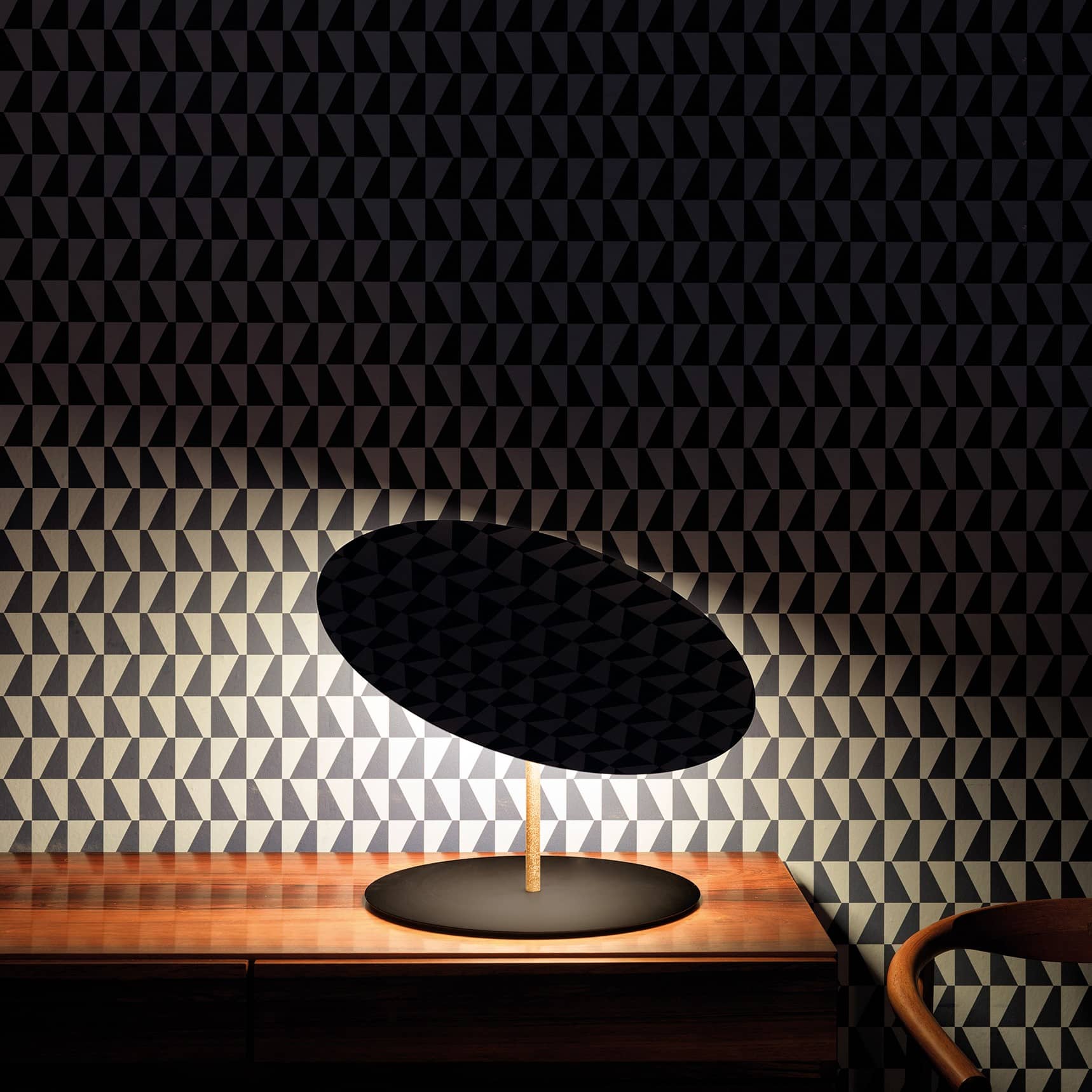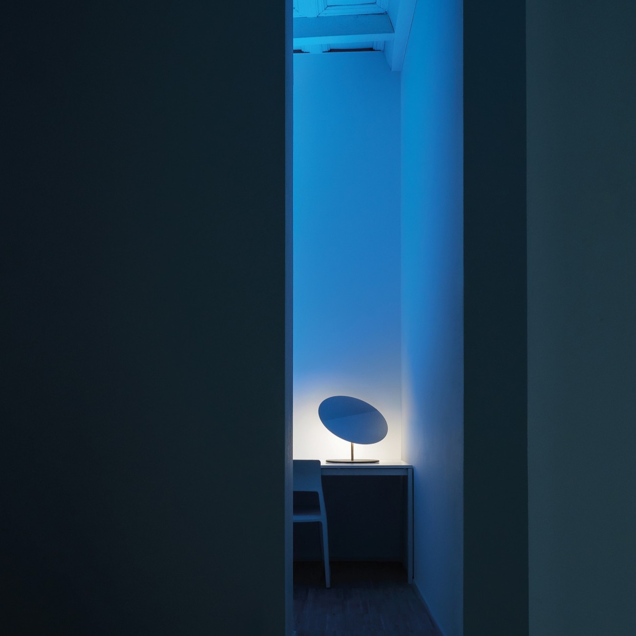 Apparecchio illuminante da tavolo. Disco con finitura a specchio orientabile in tutte le direzioni. Retro del disco blu opaco. Stelo in ottone. Dimmer lungo il cavo. Cavo nero.