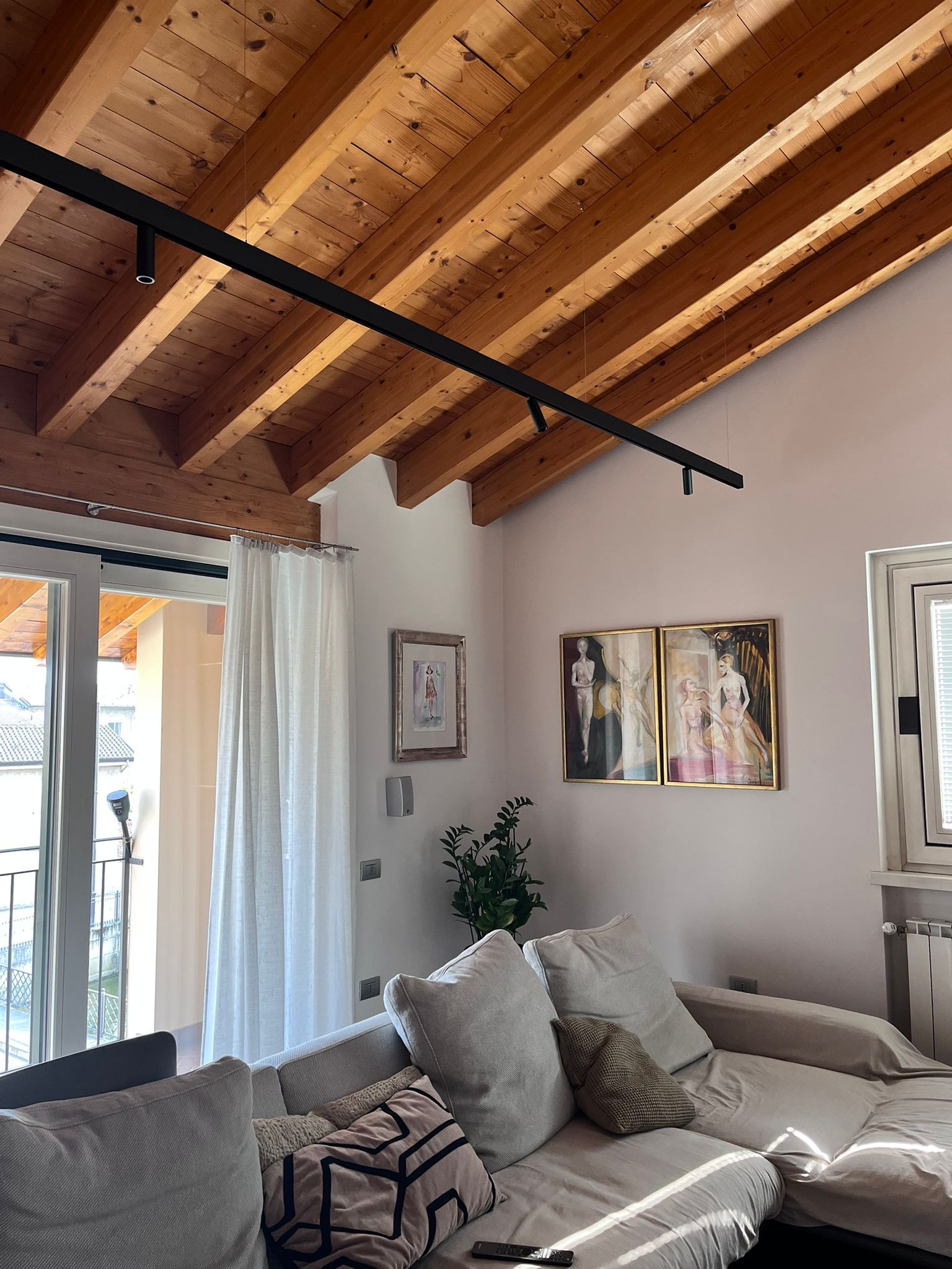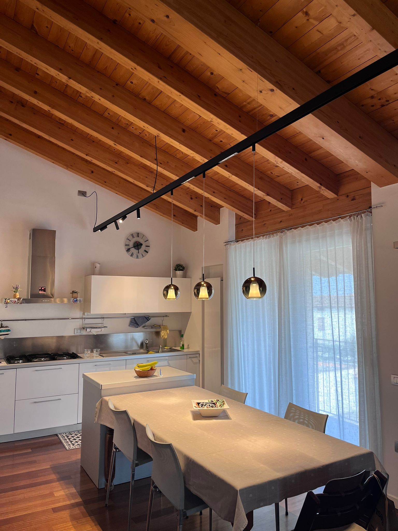 Binario sospeso della ditta BIFFI LUCE con tre sospensioni KON finitura bronzo, posizionato sopra la zona pranzo per un’illuminazione mirata e decorativa. Completano il sistema i faretti LEO, integrati per offrire una luce calibrata che valorizza l’atmosfera degli ambienti.